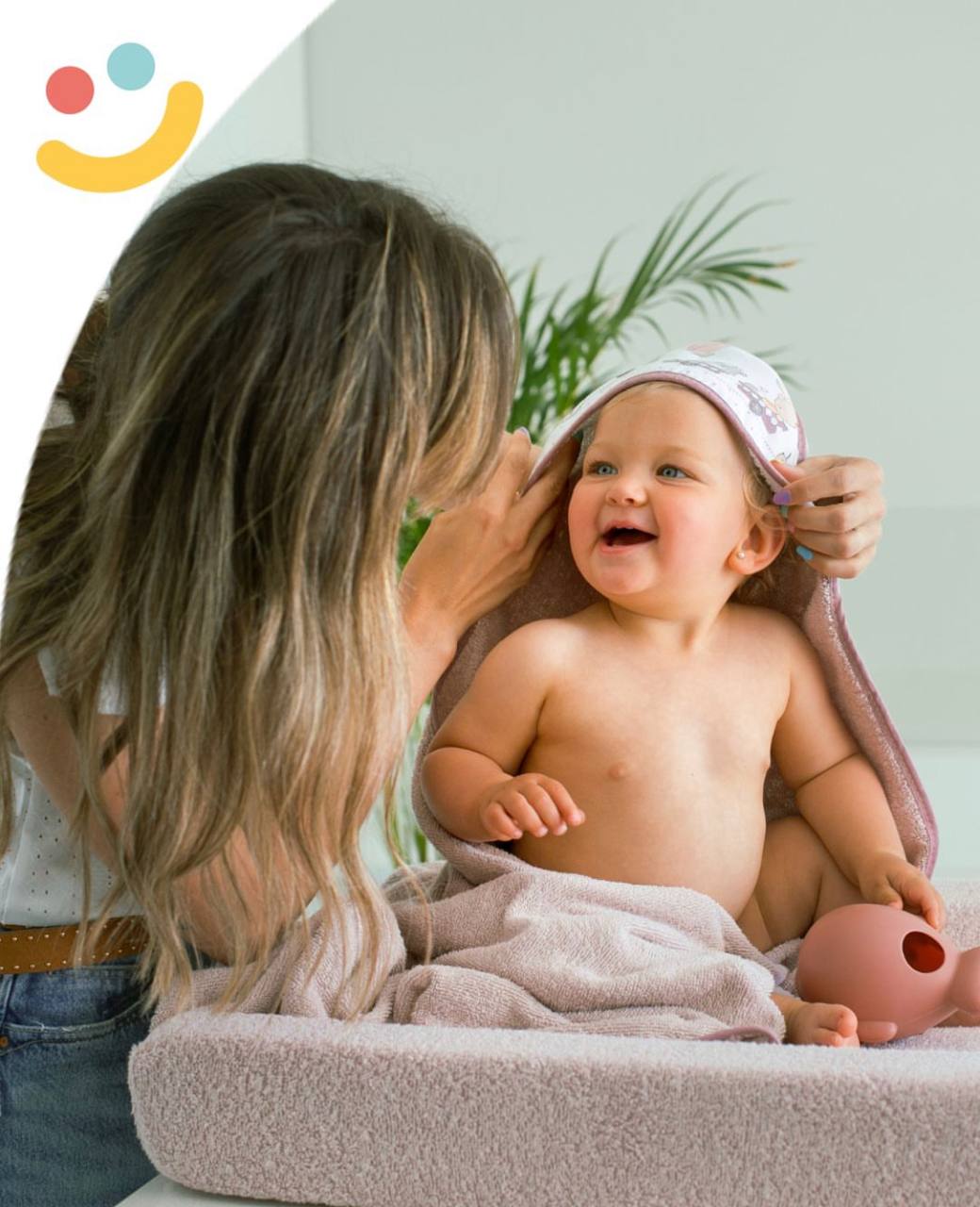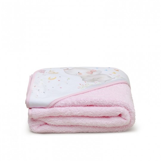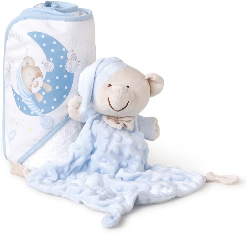 Ensemble de bain composé d’une couche de tissu éponge 100% coton et d’un doudou.