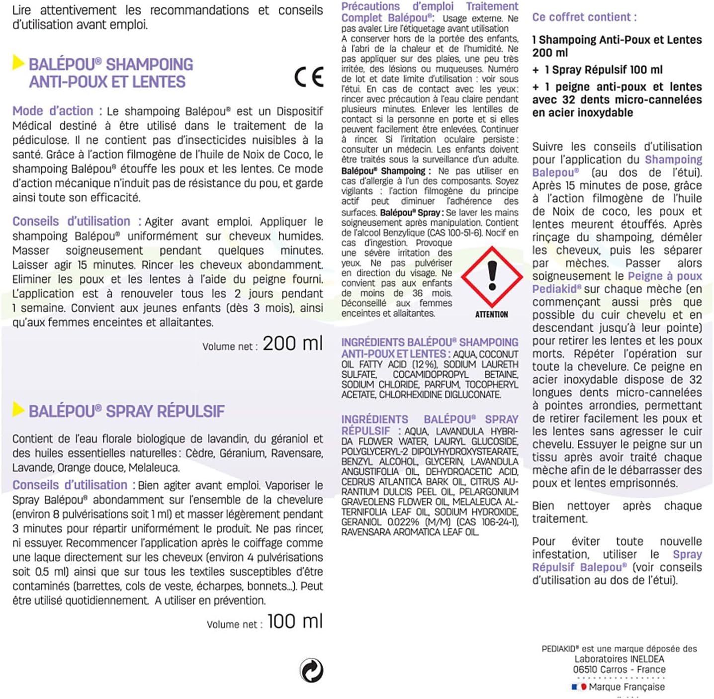 - TRAITEMENT ANTI-POUX POUR ENFANTS : Contient un Dispositif Médical, le shampoing Balépou Pediakid, qui lutte efficacement contre les poux et les lentes. Avec des actifs d’origines naturelles et une action rapide de 15 minutes, il est parfaitement adapté aux enfants.